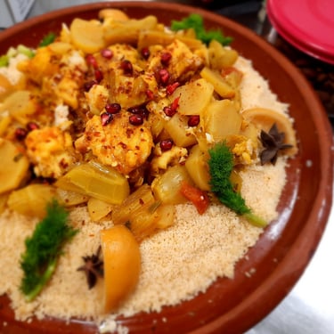 Bonjour à tous ! Jeudi prochain, le 11 décembre, entre 18h et 19h, je vous propose de retirer un COUSCOUS VÉGÉTARIEN : semoule de blé complète, trois légumes de saison, boulettes au quinoa. Prix : 9.00 euros la part. Vous pourrez aussi retirer un velouté de chou fleur à la saucisse de morteau ( 6,50 euros la bouteille) / velouté de chou fleur nature ( 5,50 euros la bouteille). En vous souhaitant un agréable week-end 🪷. Pascale.